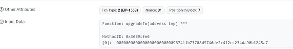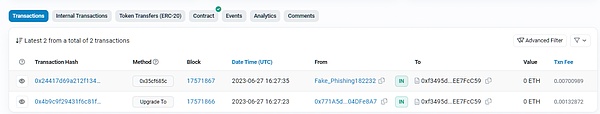 Beosin安全团队分析发现攻击者诱导受害者调用Upgrade To函数,修改了受害者的OpenSea账户代理合约的实现合约地址。由于实现合约已经被修改成恶意合约,攻击者此时可以直接调用合约转走受害者的NFT。