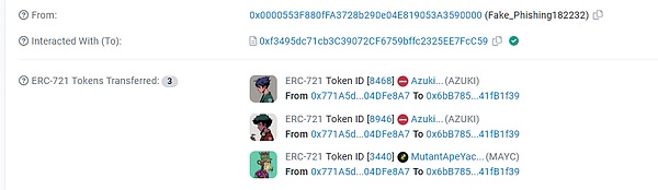 据区块链安全审计公司Beosin旗下Beosin EagleEye安全风险监控、预警与阻断平台监测显示,2023年6月28日,某用户的AZUKI#8468、AZUKI#8964被盗。受害者访问了攻击者精心构造的钓鱼网站,点击了需要通过钱包确认的操作(可能被伪装成领取奖励等),导致被攻击。