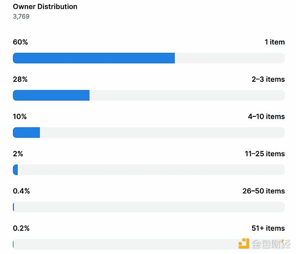 根据 OpenSea 数据,截止撰稿时,Azuki Elementals(已开图)总量为 9456 枚,其中约 60% 的持有者持有 1 枚 Elementals NFT,约 38% 的持有者持有 2-10 枚,约 2.6% 的持有者持有 10 枚以上。