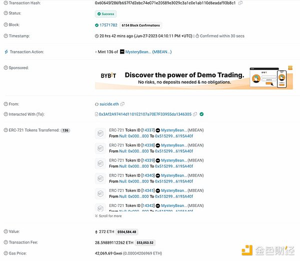 suicide.eth 是第四大 Elementals 预售参与者,用 272 ETH 铸造了 136 枚 Azuki Elementals Beans,值得注意的是,其还支付了高达 5.3 万美元(约 28.6 ETH)的交易费用。