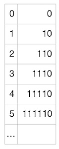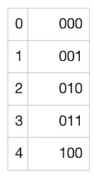 上述映射很容易理解:数字 1 的数量表示了我们要编码的商,而 0 表示商编码的结尾。所以,对我们列表中的每一个数字,我们都可以使用上述表格来编码商,然后使用可以表示最大值为 M-1 的比特川,将余数转化为 2 进制。在这里余数为 4,只需要 3 个比特就可以了。这里是一个展示我们的例子中可能的余数及其编码的表格: