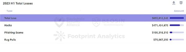 据区块链安全审计公司Beosin旗下Beosin EagleEye安全风险监控、预警与阻断平台监测,2023年上半年Web3领域因黑客攻击、钓鱼诈骗和项目方Rug Pull造成的总损失达到了 6 亿 5561 万美元。其中攻击事件 108 起,总损失金额约 4 亿 7143 万美元;钓鱼诈骗总损失金额约 1.08 亿美元;项目方Rug Pull事件 110 起,总损失约 7587 万美元。