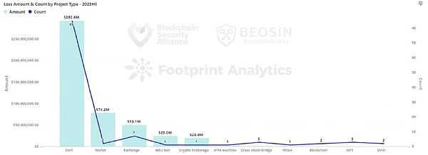 2023年上半年,DeFi类型项目共发生 85 次安全事件,占总事件数量的 78.7% 。DeFi总损失金额达到了 2.92 亿美元,占总损失金额的 62% 。DeFi为被攻击频次最高、损失金额最多的项目类型。