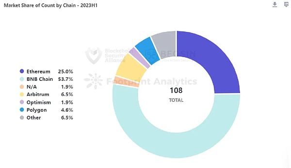 BNB Chain上监测到了最多的攻击事件,达到了 58 起,攻击事件总数占所有事件的 53.7% 。BNB Chain上发生的58次攻击事件里,有40个被攻击项目都未经审计。