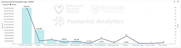 即便黑客攻击大幅放缓,合约安全问题依旧不能忽略。2023年上半年,最频发、造成损失最多的攻击手法为合约漏洞利用。60次合约漏洞事件造成了2.64亿美元的损失,其中绝大多数被利用的漏洞是业务逻辑问题。一些较为复杂的业务逻辑漏洞,需要经验丰富的专业审计公司才能发现。Beosin审计团队会对每一次黑客攻击事件都会进行深入分析(推特@BeosinAlert),确保将其中总结出的经验和技术应用到项目审计过程中,以应对实际可能发生的黑客攻击。