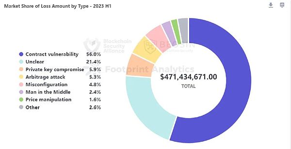 2023年上半年,攻击原因最频发、造成损失最多的攻击手法为合约漏洞利用。60 次合约漏洞事件造成损失 2.64 亿美元,占所有损失金额的 56%。