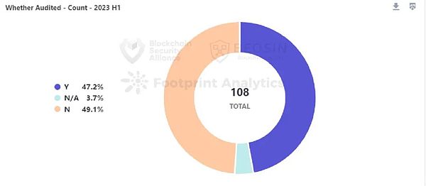 审计和未审计项目比例大致相当,在108个被攻击项目中,经过审计的项目为 51 个,未经审计的项目为 53 个,比例大致相当。该比例与2022年情况也大体一致。