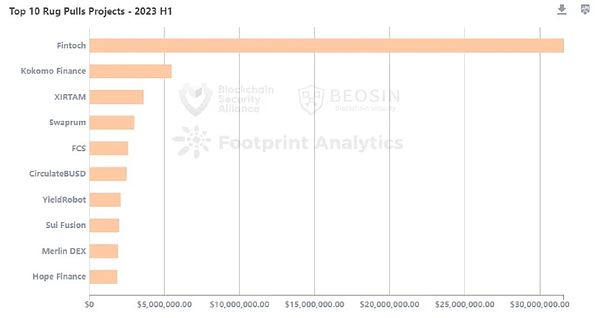 涉及金额最大的Rug Pull事件为 Fintoch 项目,该项目卷走了约 3160 万美元的资产。