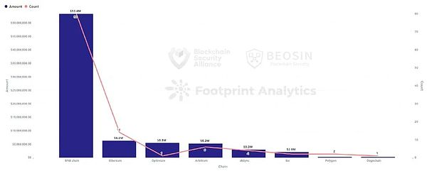 从链平台来看,BNB Chain上发生了80起Rug Pull事件,涉及金额5337万美元,远远高于其他的公链。