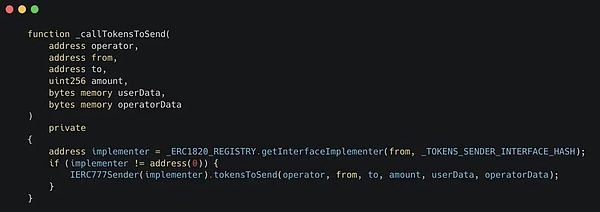 项目和审计人员必须注意到ERC777中描述的Hook行为。这些代币不仅对接收者和发起者进行调用,也对其他一些Hook接收者进行调用。
