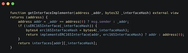 这个函数从_ERC1820_REGISTRY中读取称为implementer(实现者)的合约