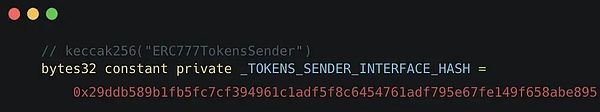 变量_TOKENS_SENDER_INTERFACE_HASH被用作_interfaceHash,它可以是任何字节。但是VRA代币使用这些字节来识别这种类型的Hook: