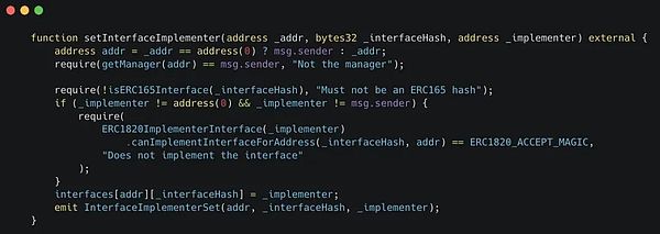 项目方最好限制使用 Registry1820作为任意调用的地址。因此,没有攻击者能够利用任意调用来设置接口实现者。
