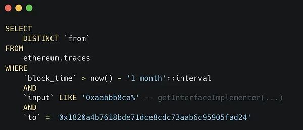 我们可以使用这个SQL脚本。事实上,我们应该另外过滤出代币地址,但至少我们有一个完美的开始,结果有78个地址。