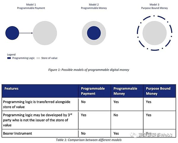 可编程货币指的是在价值存储本身内部嵌入规则,定义或限制其使用的可能性。例如,可以定义规则,使得价值存储只能发送到白名单钱包,或在完成交易级别筛选后转账。可编程货币的实施包括代币化的银行负债和中央银行数字货币。不像可编程支付,其中编程逻辑和价值本身是解耦的,可编程货币是自包含的,包含编程逻辑并作为价值存储。当可编程货币被转移到另一方时,逻辑和规则也被移动。