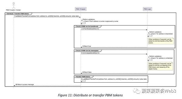 在分发或转移阶段,PBM代币以封装形式被转移。这两个阶段唯一的区别是涉及的角色。图11说明了涉及的步骤。