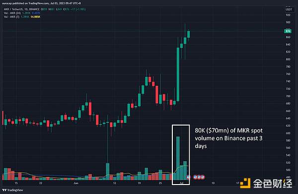 尽管处于美国的长周末期间,过去 3 天币安上仍有 7000 万美元的 MKR 现货交易。