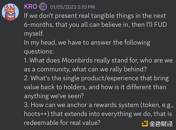 从今年年初开始,我想要真正挑战自我,回答一些非常重要的开放性问题。因此在 2023 年 1 月 5 日,我在 Discord 中向 Moonbirds 社区发布了这样的内容: