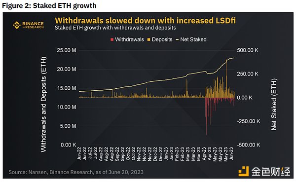 在以太坊的Shapella升级之后,由于能够提款,用户对质押的信心增加了。尽管在最初几天有大量提款,但随着流动性风险的降低和LSDfi协议的日益普及,提款放缓了。LSDfi为用户提供了提高产量的新机会,我们将在本报告的后面部分进一步讨论。