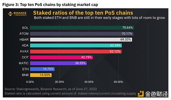 截至 2023 年 6 月 27 日,质押的 ETH 代币与其流通供应量的比例为 16.70%,而 BNB 的比例为 14.55%。这些数字表明,考虑到其余前十名PoS链按质押市值(“市值”)的平均质押率为49.67%,两条链都有很大的发展机会。