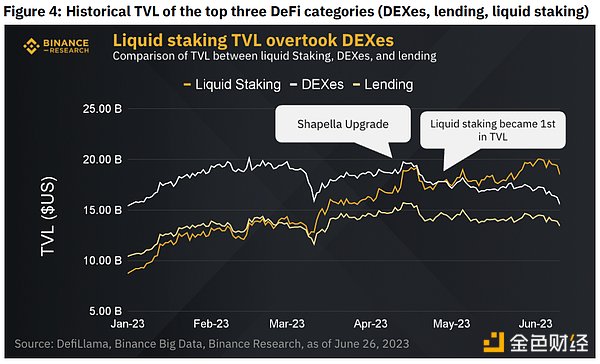 锁定总价值(“TVL”)为184.8亿美元,自年初以来增长了131.67%,流动性质押目前在不同DeFi行业的TVL中排名第一。2023 年 4 月 28 日,它首次以 680 万美元的 TVL 差价取代了 DEX,这是 TVL 最大的领导者。