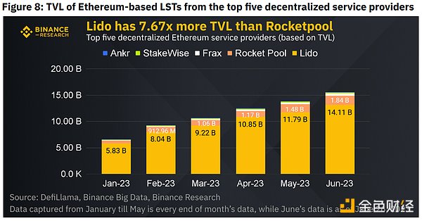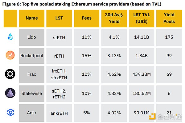 顶级提供商(TVL):Lido,Rocketpool,Frax,Stakewise,Ankr 典型的费用似乎在10%左右,但Ankr和Rocketpool除外。尽管费用最低,为5%,但Ankr的TVL仍然落后,如下图6所示。