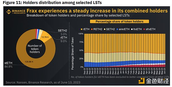 不可否认,stETH拥有最大的代币持有者份额,因为它在质押的ETH和TVL中都占据主导地位。自 2022 年 9 月以来,ankrETH 和 SETH2 的代币持有者百分比份额有所下降,尤其是在 Frax 进入流动性质押市场的情况下。