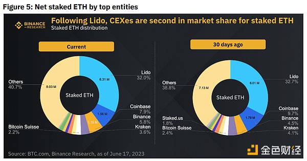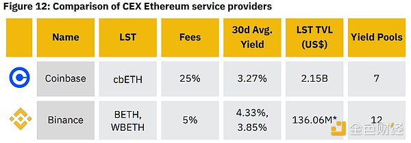 CEX服务提供商是托管池质押的另一种形式。在以太坊上,Coinbase cbETH在中心化交易平台中拥有最高的TVL,其次是Binance WBETH。