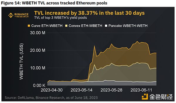 WBETH可以从币安铸造或提取,并用于煎饼掉期和曲线等DEX上,在包括激励措施后,作为流动性提供者,奖励的年收益率(“APYs”)高达21.03%。跟踪的DEX池的TVL已达到18.51M美元,预计随着LST采用的增加而增长。