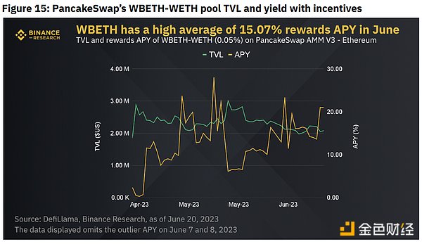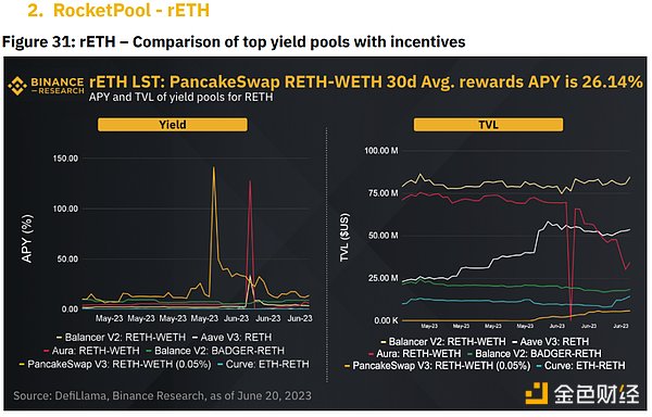 PancakeSwap 提供最高的 APY 总奖励,当月平均为 23.25%。 PancakeSwap RETH-WETH 矿池的采用率有所增加,自 6 月初以来,其 TVL 增长了 203.14%。