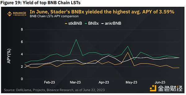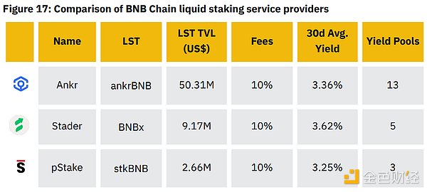 由以太坊推广的流动性质押也可以在 BNB 链等链上访问。前三大主要服务提供商——pStake、Ankr和Stader——都有一套相同的标准费用,其中BNBx的30天平均年利率最高,为3.62%。所有三个LST - BNBx,ankrBNB和stkBNB都是有回报的代币。