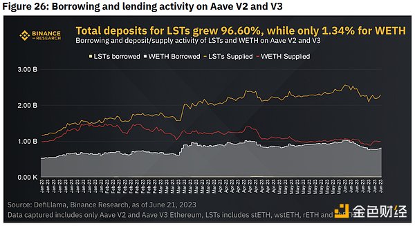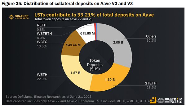 在TVL的四种监控贷款协议中,Aave以96.73%的份额主导市场。仅在Aave上,LST已经超过WETH,成为V2和V3的主要抵押存款。