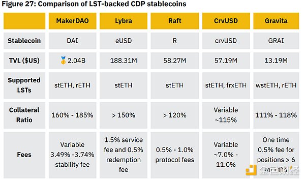 CDP 是通过在智能合约中存入和锁定抵押品(在本例中为 LST)并因此铸造稳定币来创建的。由于代币发行量增加带来的高 APY,围绕新协议的炒作很多,但 MakerDAO 等 OG 协议仍然是明显的市场领导者,从存入的 LST 中铸造了 4.844 亿 DAI。与 DAI 铸造量相比,铸造量显着高出 5,730% eUSD (Lybra),尽管抵押率最高,费用相对较高。