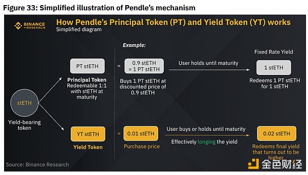 截至 2023年 6 月 28 日,它目前拥有 43.9K 推特粉丝。该协议作为 LST 的流动性挖矿和高 APY 的早期提供商在加密社区中广受欢迎。这是通过收益代币化实现的,这涉及将收益代币拆分为委托代币 (PT) 和收益代币 (YT)。下面的图 33 提供了一个简化的图表来说明它是如何工作的。