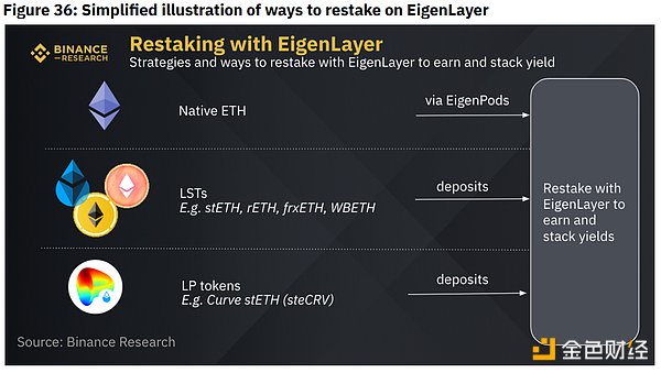 EigenLayer 引入了 restaking 的概念,允许用户通过加密经济安全性的扩展来重新获取他们的 LST 或 ETH 来保护其他应用程序。他们总共筹集了64.5百万美元,其中包括最近三月份的A轮融资的5000万美元,现在的估值为25000万美元。截至 28 年 2023 月 74.6 日,它目前拥有 74.6K 推特粉丝。下面的图 36 是使用特征层重新质押的潜在方法的简单说明。