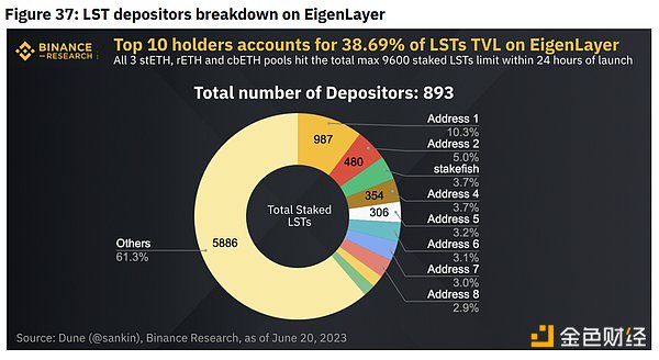 对于 LST,该协议目前支持 rETH、stETH 和 cbETH,初始限制为每个池 3,200 个 LST。所有三个池都很快达到上限,共有 873 个唯一存款人,前十名持有者占质押 LST 总数的 38.69%。