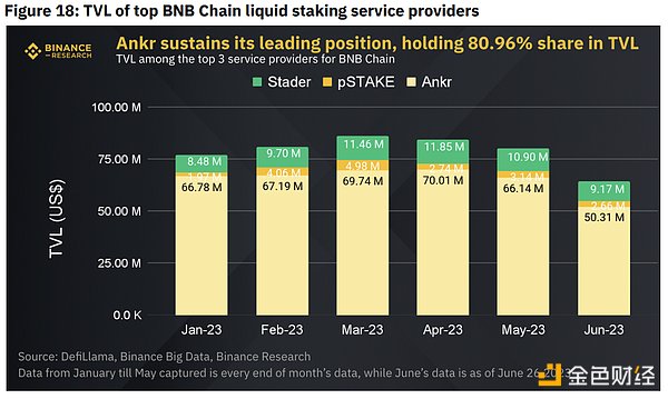 要成为 BNB 链上排名前 21 位的当选验证者之一,一个人将需要大约 100,000 个 BNB。对于大多数零售用户来说,这可能不可行。因此,引入了池质押,可以将他们的 BNB 委托给选定的节点。Ankr主导着BNB Chain的流动性质押市场,在顶级提供商中占有81.18%的份额(基于TVL)。