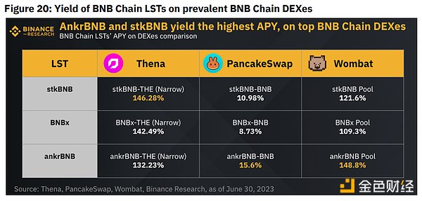 在收益率方面,Stader的平均APY最高,为3.59%,Ankr在最近一个月的平均APY为3.36%,排名第二。尽管如此,作为DEXes的LP,stkBNB在Thena上产生了最高的回报,而ankrBNB在PancakeSwap和Wombat上产生了最高的回报,如下图20所示。