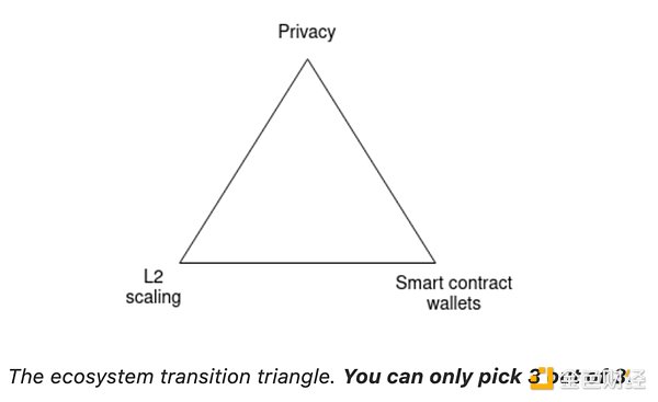 以太坊依赖于三个基本要素来蓬勃发展:第二层(L2)扩展、钱包安全和隐私。这三个要素内在地相互关联,每个要素在以太坊的功能中都起着至关重要的作用,如果其中一个要素出现问题,整个系统就有崩溃的风险。请不要将其与区块链三难问题混淆,后者指的是没有一个区块链能够同时优化分散化、安全性和可扩展性这三个特性。