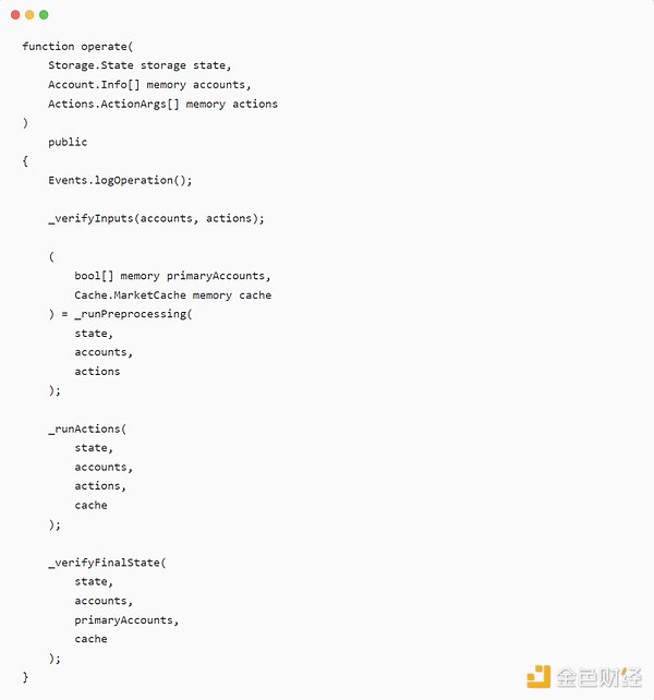 这个合约的结构真的很有趣 -- 用户可以在一连串的行动中执行他们想要的行动(存款、借款、交易、转让、清算等)。想存入 3 个不同的代币,提取第 4 个,并清算一个账户?这是一个单一的调用。