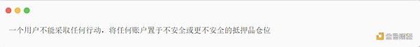 如在借贷市场中:用户不能采取任何行动,使任何账户处于不安全或更不安全的抵押品仓位(「更不安全」意味着它已经低于最低安全阈值,因此不能进一步提取)。
