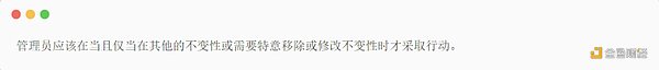 解读:管理员可以做一些应该结果不会破坏不变性的事情,除非他们为了保护用户的资金而大幅改变事情(例如:将资产转移到救援合约中是对不变性的移除)。管理员也应该被认为是一个用户,所以核心借贷市场的用户不变性也应该对他们成立(意味着他们不能对其他用户或协议进行攻击)。目前,一些管理员的行为不可能在运行时通过 FREI-PI 进行验证,但如果在其他地方有足够强大的不变性,希望大多数问题可以得到缓解。我说目前,因为人们可以想象使用 zk 证明系统可能会检查合约的整个状态(每个用户、每个预言机等)。