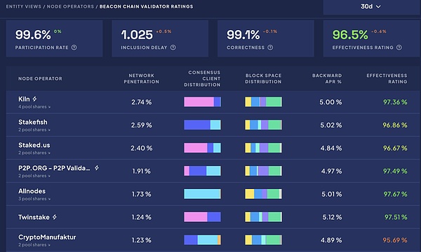 通常用户选择节点运营商的主要指标是 APR。你会查询每个运营商一段时间内的APR收益,然而,由于以太坊复杂的奖励结构(每月甚至每季度的 APR 高度依赖于许多随机变量,例如创建的区块数量或提取的 MEV,并且它不能反映真实的运营商绩效),最好是通过验证者的有效性评级而不是 APR 来比较质押提供者。