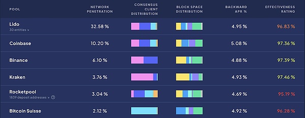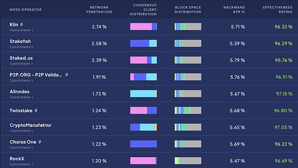 从网站的node operators视角查看,我们可以看到市面上比较主流的大型节点运营商,每个节点运营商的市场占有率都不算太高,目前没有一家能超过3%,相对pooled staking中lido的一家独大还是比较去中心化的。