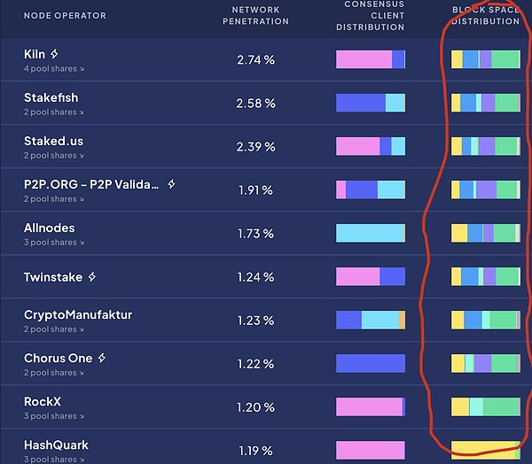 一个节点运营商接入的MEV relays的数量会影响你能够获得MEV收入的多少。目前,有十个活跃的MEV中继。如果验证者连接到每个中继,它会收到更多的出价,并可以选择最有价值的出价,从而获得更高的 MEV 奖励。在rated我们可以看到最大的几家节点运营商在BLOCK SPACE DISTRIBUTION这一列的图形几乎差不多,几乎所有的区块都是通过MEV-boost进行中继的,这样可以最大化MEV的价值提取,提高APR收益。