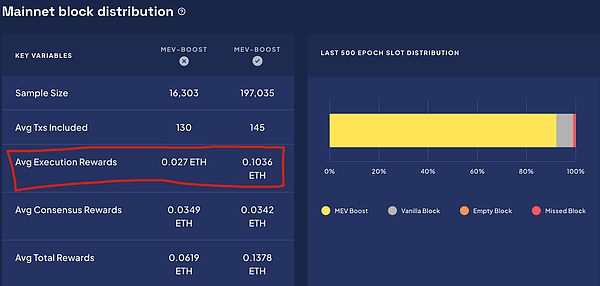 过去30天,共识层的奖励对于使不使用MEV-BOOST来说并不重要,几乎没有差别,但是执行层的奖励,使用MEV-BOOST可以将奖励提升将近4倍。这个差异在最近一个月gas fee低迷的行情下还不算显著,4月份的时候,使用MEV-BOOST甚至一度将执行层奖励提升了10倍以上,这就是MEV在提升APR质押收益中的作用。