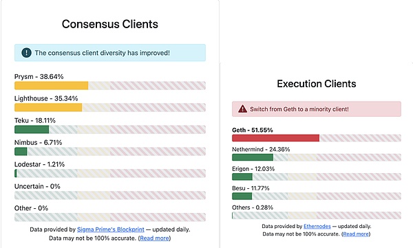 潜在的大规模罚没对于以太坊质押者来说绝对是个灾难级别的事件,这也是为什么以太坊社区非常追求客户端的多样化,目前共识层的客户端基本上是两家独大,Prysm和Lighthouse总计占比74%,执行层客户端更是一家独大,可以说其中任何一家出现了严重bug都有可能造成以太坊POS的严重罚没事件发生。所以对于个人质押者,选择具有client diversity的节点运营商非常重要,尤其是具有少数派客户端(minor clients)的节点运营商恐怕危及时刻可以救命。