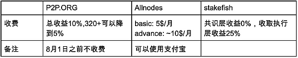 综合来看,Allnodes的费用最为低廉,高级计划按照现在1900$的以太坊价格计算,年费用也只有收益的4%,有一点我很喜欢的是,费用是用美元核算的,所以如果未来以太坊价格大幅上涨,其他运营商按以太进行比例抽成的模式费用就会变得很高。