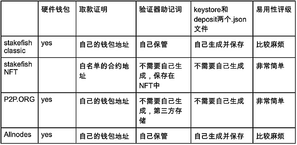 上面的操作对于质押新人来说有一定心理上的压力,尽管并不复杂,但建议多练练再进行实操,还可以在Goerli测试网络上操作一遍。一些质押服务商也很贴心的准备了更简单的质押方案,比如stakefish 的NFT质押方式,P2P.ORG也几乎可以一键进行质押,不需要过多操作。但操作方便性会有一定的代价,stakefish 的NFT质押的取款地址并不是你自己的地址,而是一个白名单合约地址。P2P.ORG则是代你生成并管理验证器密钥,而你需要在平衡安全和易操作性上做出自己的选择。