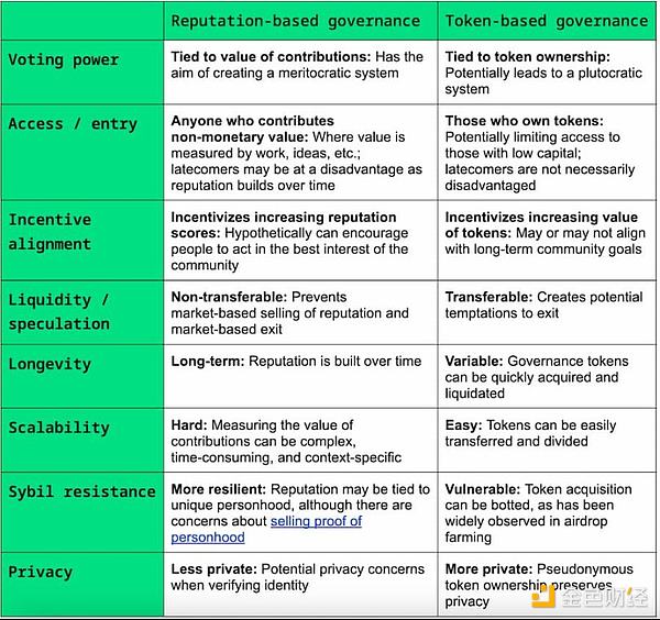 Web3 治理的早期实验通常是基于代币的,但目前倾向于将更多基于信誉的系统作为默认系统,因为如果成功实施,将具有明显的优势(总结如下表)。